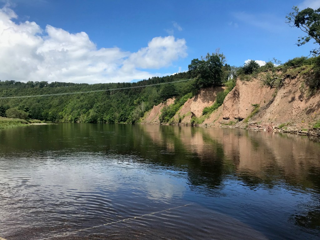 This is another lovely walk and on the day in question, very quiet indeed. The landscape in this part of the Borders is quite different to Peebles and the surrounding environs. Once you get past the Eildon hills (below) near Melrose, you are very much in “rolling-hill” country. And so the river spreads itself out accordingly.